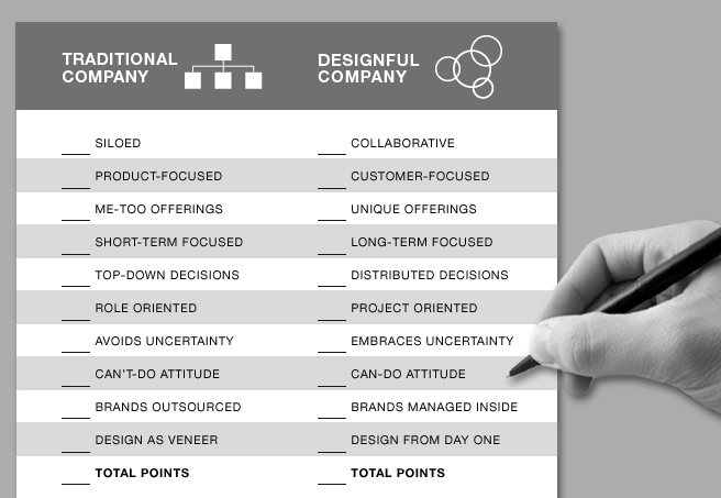 How do you create a culture of innovation? By recognizing one simple fact: If you want to innovate, you've got to design. Design and design thinking are the tools that create new products, new services, new business models, new markets, and new industries. The best way to leverage innovation is to build a "designful company". To find out where you are on the culture curve, take this simple test: Share a total of 10 points across each of the 10 pairs below. For example, if your company is more siloed than collaborative, you might score it 6 and 4. When you've finished, add up the two columns to measure your progress. If your totals come out to 60 and 40, for example, you could say that you're 40% along the path to an innovative culture.